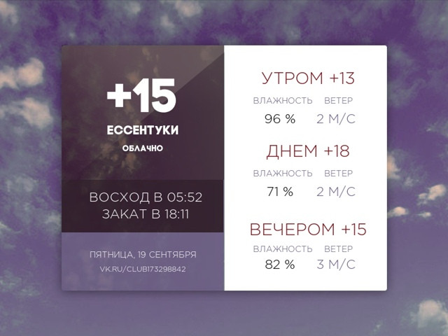 🌇 Вечер 15°C ☁ Пасмурно ☁ Ощущаемость: 15 Ветер: 2 м/с, Давление: 710 мм рт. ст. Влажность: 63 %
