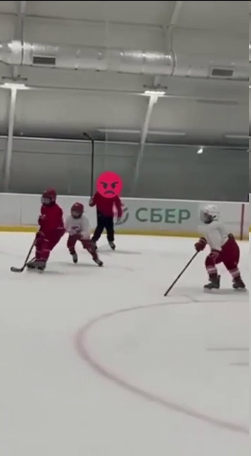 На опубликованных кадрах видно, как мужчина орёт на ребёнка, бьёт по шлему и спине, после чего грубо валит его на лёд.