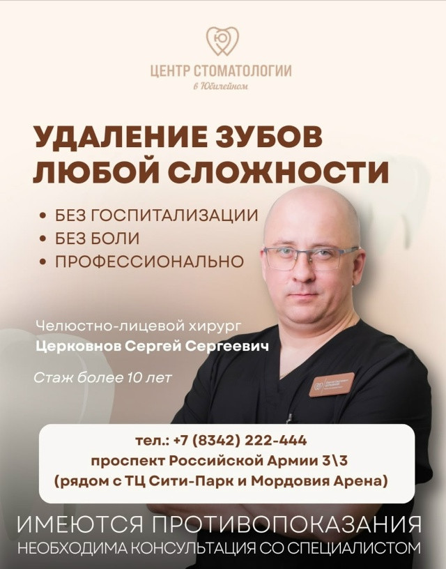 В Центре Стоматологии в Юбилейном https://vk.com/stomacenter... вы получите профессиональную помощь от опытного челюстно-лицевого хирурга Сергея Сергеевича Церковнова, стаж работы более 10 лет.