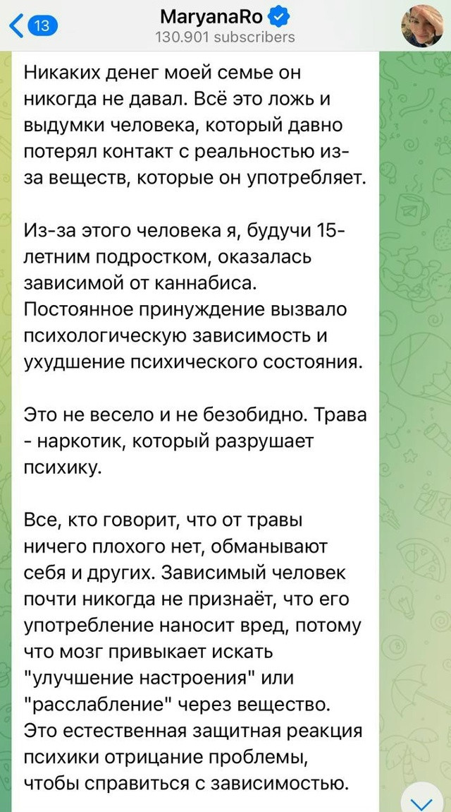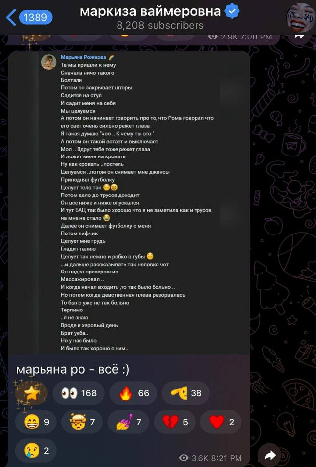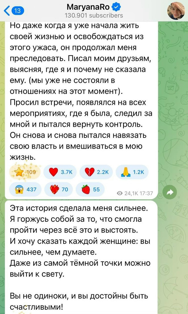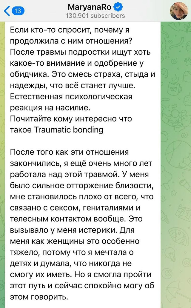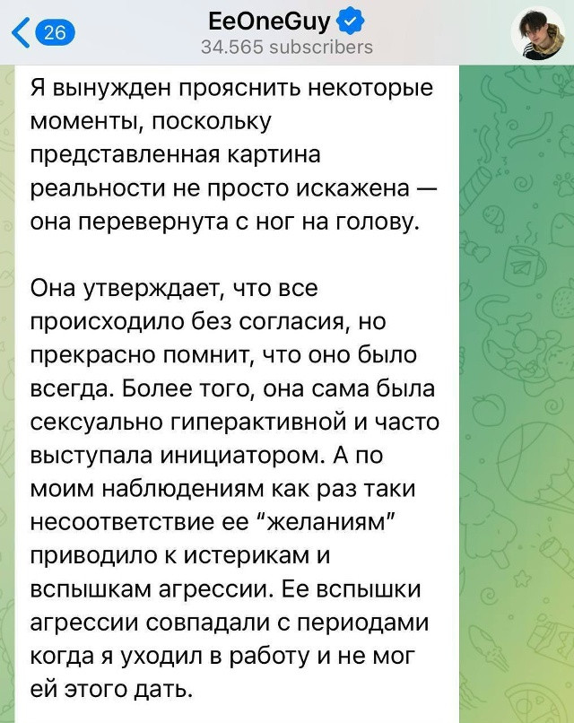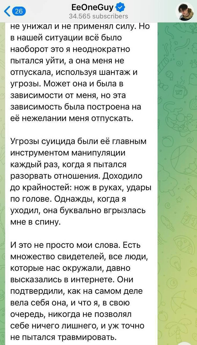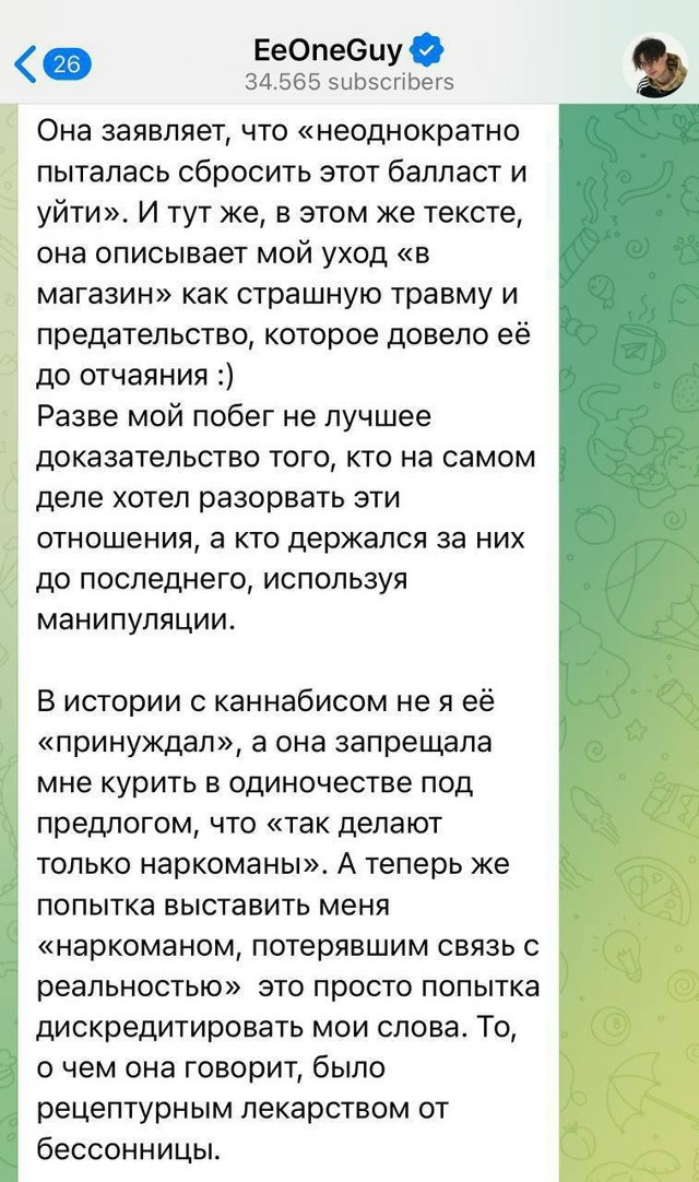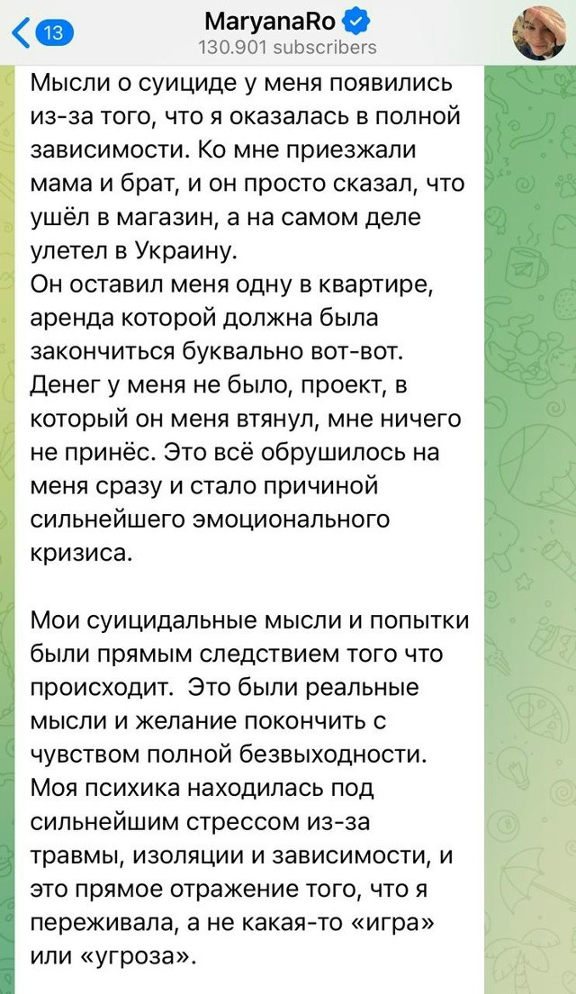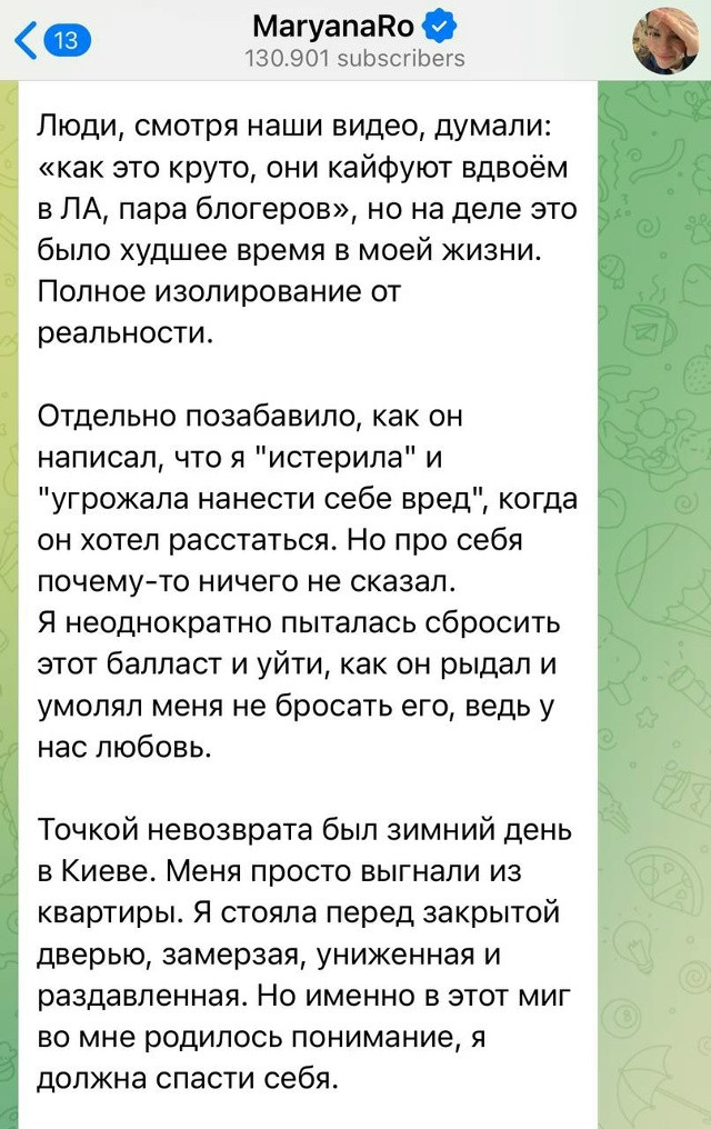 Он заявил, что интим всегда был по обоюдному согласию, а инициатором часто выступала она. По словам блогера, Марьяна проявляла агрессию, могла напасть физически и угрожала самоубийством, используя это как способ удержать его в отношениях.