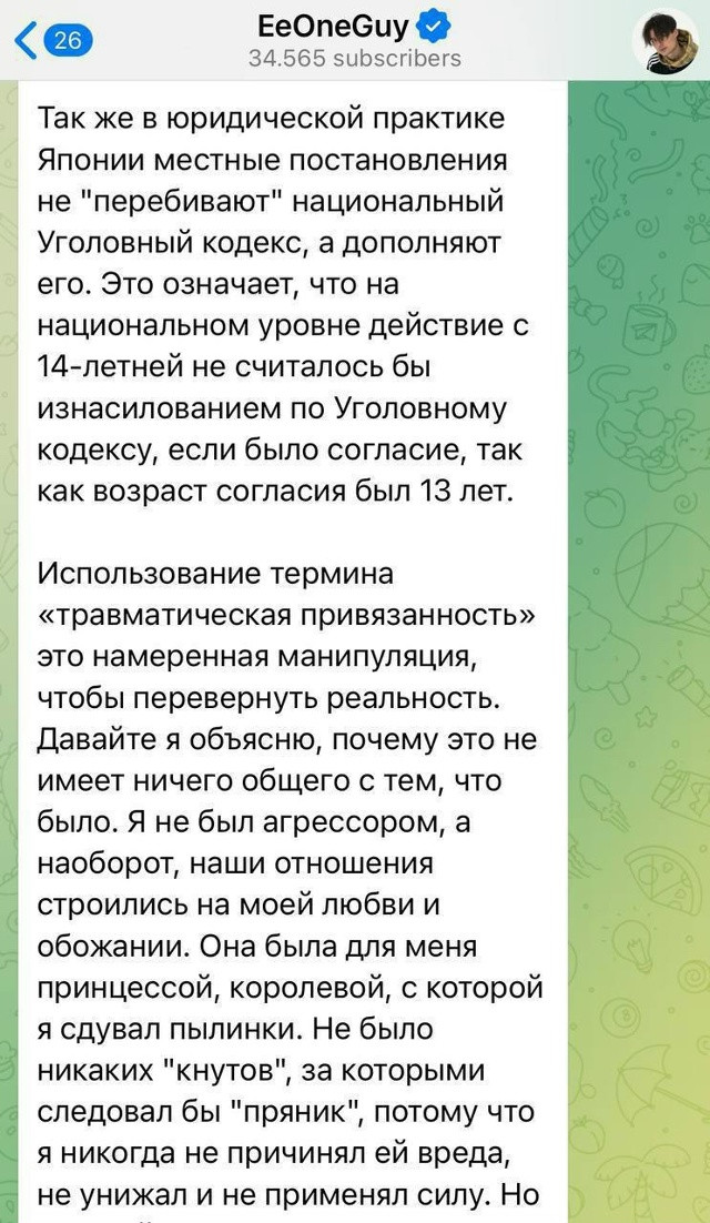 «Он зачем-то лживо пишет о том, что в Японии возраст согласия - 13 лет. В реальности на Хоккайдо он - 18 лет, и любые сексуальные действия с лицом младше 18 лет считаются преступлением на территории Хоккайдо. К тому же согласия не было», — написала Марьяна.