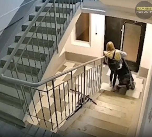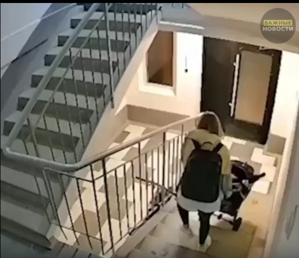 На записи видно, как мать с трудом спускает коляску по лестнице, игнорируя плач ребенка. При попытке открыть дверь на лестничной клетке она разбивает стеклянную вставку ударом ноги, падает вместе с коляской на осколки, после чего продолжает движение.