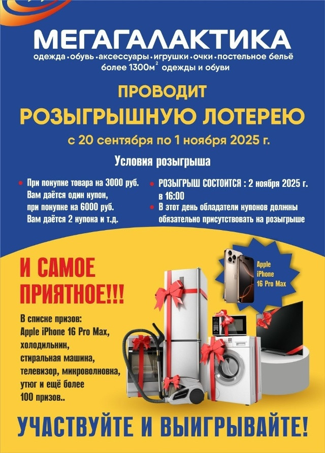 Магазин "МЕГАГАЛЛАКТИКА Одежда и обувь" проводит розыгрышную лотерею с 20 сентября по 1 ноября . Условия розыгрыша: при покупке товара на 3000 руб.Вам даётся один купон, при покупке на 6000 руб.
