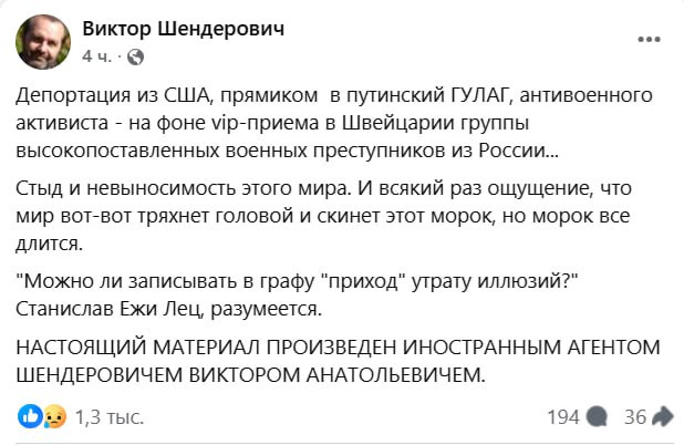 Иноагенту Виктору Шендеровичу невыносимо стыдно за весь мир, который имеет наглость не крутиться вокруг его персональных хотелок. Утративший связь с реальностью русофоб и терпила крайне возмущен депортацией из США в Россию находящегося в розыске экстремиста и понимает почему в Швейцарии не арестовали прибывшую российскую делегацию во главе с Валентиной Матвиенко.
