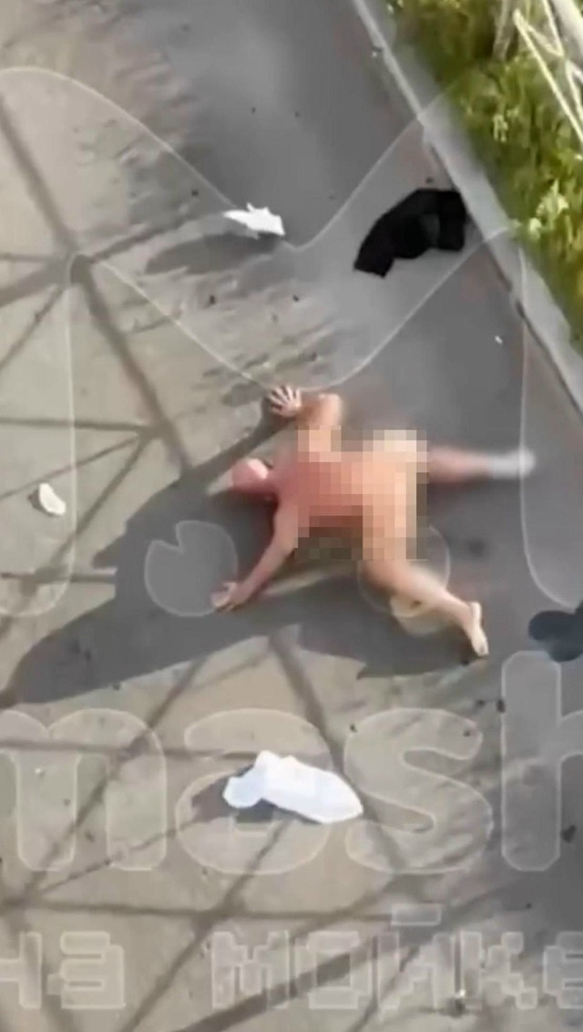Абсолютно голый любитель запрещенки валялся на асфальте в очень необычных позах, демонстрируя свои интимные места.