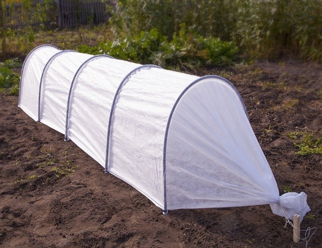 Временный парник не обязательно должен иметь прозрачное покрытие. Можно использовать и нетканые материалы, например, спанбонд, лутрасил. Но все же чаще всего дачники предпочитают покрывать тепличку пленкой разнообразной фактуры и расцветки.