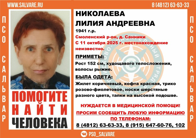 👤Как рассказали в [https://vk.com/pso_salvare... «Сальвар»], Николаева Лилия Андреевна (1941 г.р.) 11 октября пропала в Смоленском районе, д. Санники и до сих пор не вернулась.